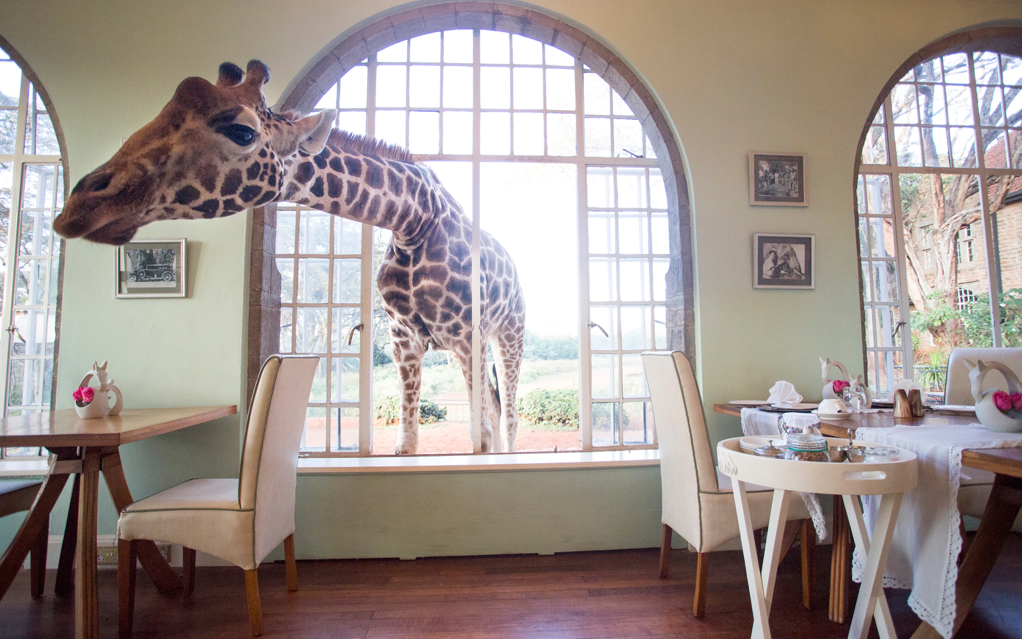“But the highlight of the Manor is the inhabitants. Thereโs a giraffe reserve next door and, when that closes for the day, the endangered Rothschild giraffes it houses saunter over to the Manorโs terrace, accompanied by their faithful warthog companions. Here the Manorโs guests feed the giraffes horse nuts, which they scoop up with their long inky blue tongues. You, meanwhile, have the most civilised of cream teas โ finger sandwiches, scones and all โ out of Royal Albert bone-china cups. The giraffes will poke their heads through the windows of the restaurant at breakfast time too, in the hopes of a treat as you eat your full English. Their fur feels rough to the touch and their eyelashes are inches long and thick as wire.